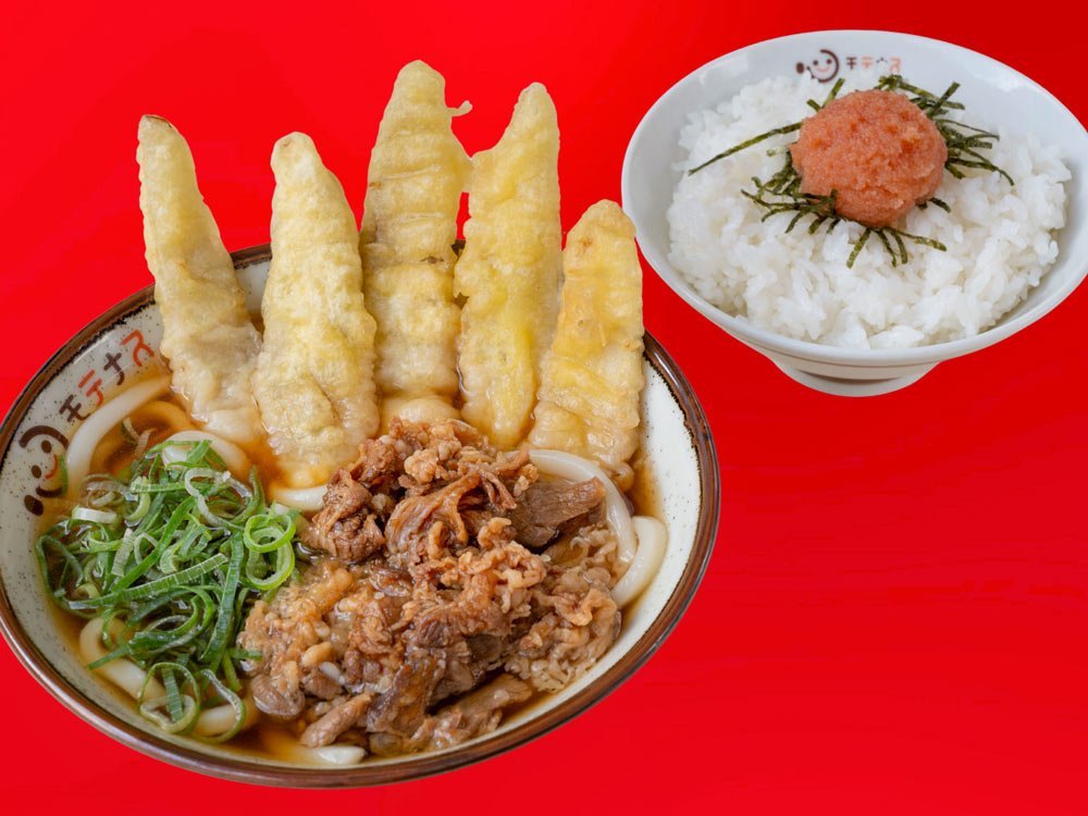 王司名物の肉うどんにごぼう天をトッピングした大人気のうどんと明太ご飯の満足セットです。