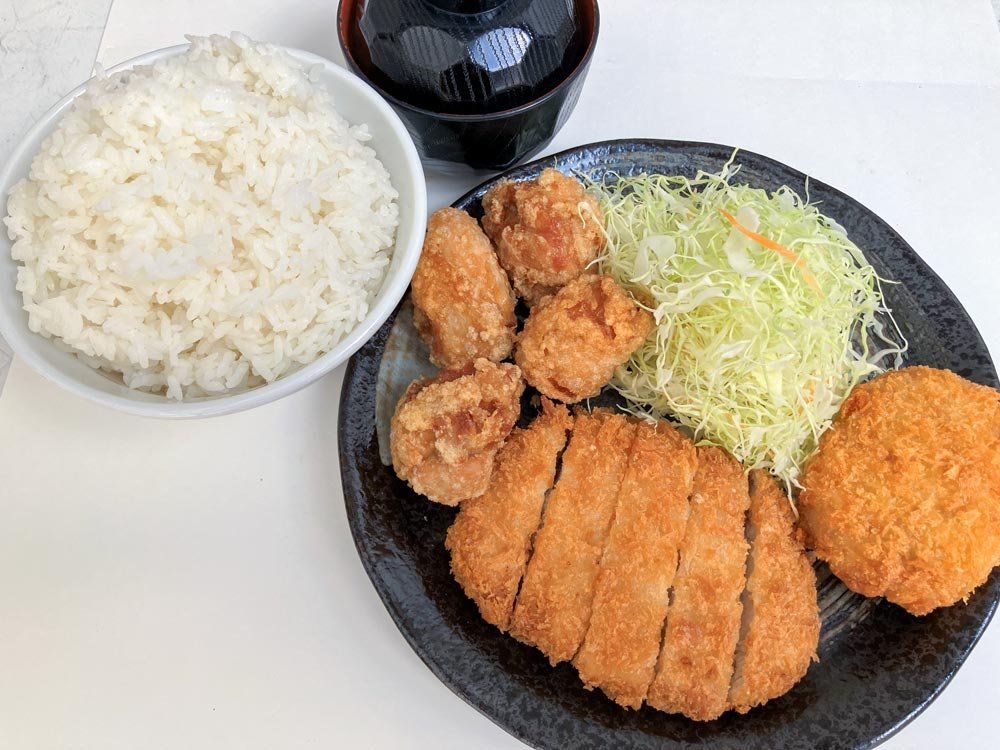 大盛りご飯にロースかつ・コロッケ・から揚げ4個のボリューム満点の定食です。