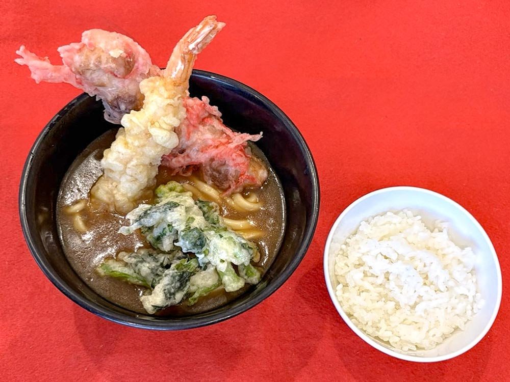 春のカレーうどんミニご飯付き (海老天・菜の花天・紅ちくわ天)