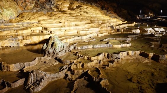 棚田のような見た目の「百枚皿」。石灰水を含んだ地下水が少しずつ流れ落ち、岩肌に沈着し皿のような形ができあがりました。実際には100枚以上あるそう!洞内の気温は年間を通じて約17℃と一定なので、夏は涼しく冬は暖かく快適に過ごせます。