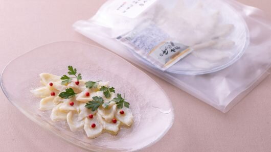 和食のイメージがあるフグをイタリアン風に楽しめる、フグ食品の老舗、日高食品の新商品。弾力のある身は噛むほどに旨みが広がります。解凍して付属のドレッシングをかけるだけなので、お土産にも自宅で食べるにもぴったりの商品です。