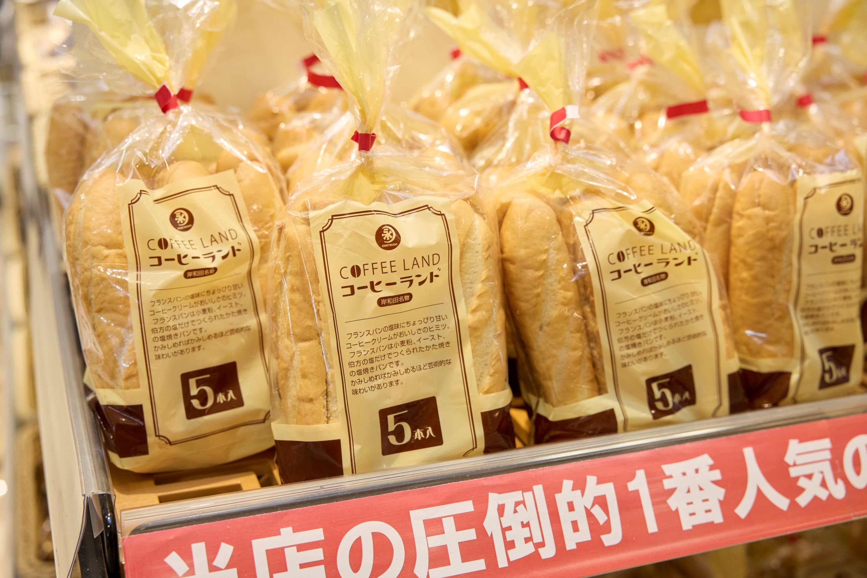 注目のお土産は、地元でも親しまれているご当地パン「コーヒーランド」(¥720)。塩気のあるフランスパンに、甘いコーヒークリームを挟んだユニークな味わいが特徴です。その場で食べるのも、まとめ買いをしてご自宅で楽しむのもおすすめ。家に持ち帰り、トースターで焼けば、パリッとした焼きたて風味の食感が楽しめます。