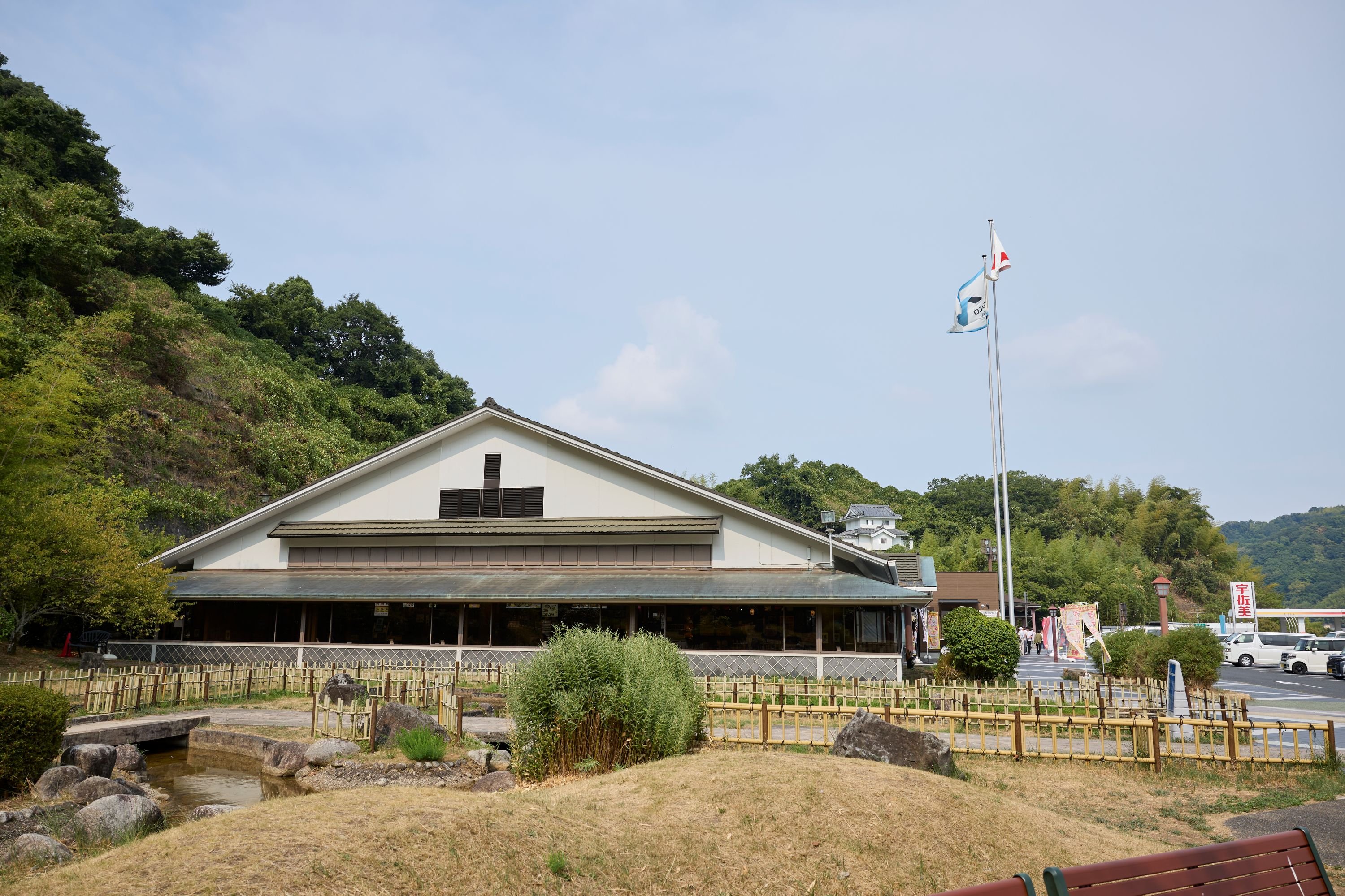 武家屋敷を思わせる外観の岸和田SA(下り線)。建物だけでなく、敷地内に広がる立派な日本庭園が、和の趣あふれる時間を演出してくれます。ドライブの途中とは思えないような、少し特別な気分を味わえるスポットです。