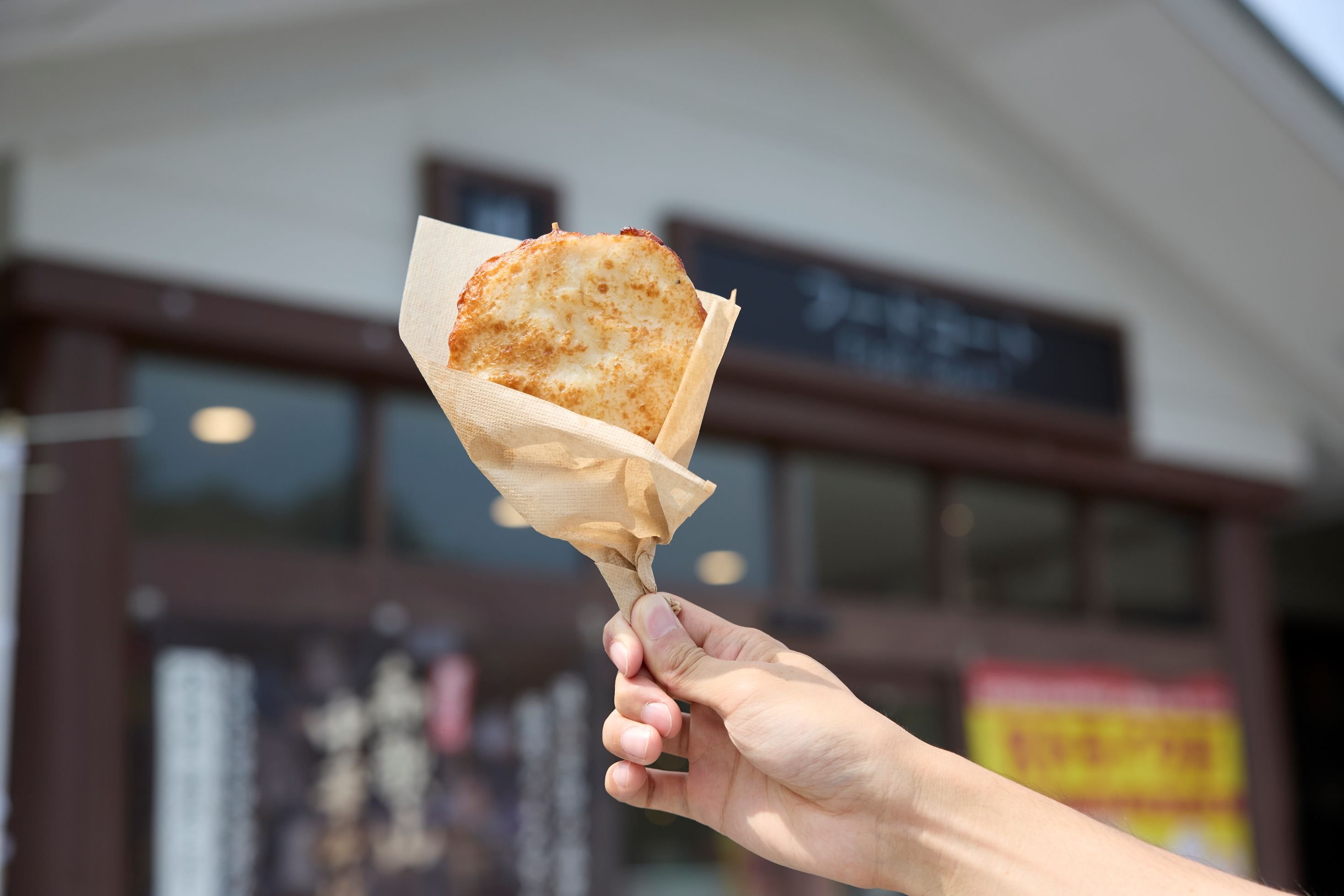 テイクアウトでは「泉州玉ねぎ天」(¥450)が大人気。泉州玉ねぎはジューシーで甘みが強く、辛味が少ないため食べやすいのが特徴です。揚げたての香ばしさと甘さが絶妙で、車内での軽食や屋外のベンチでの食事にもぴったりです。