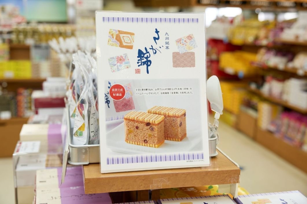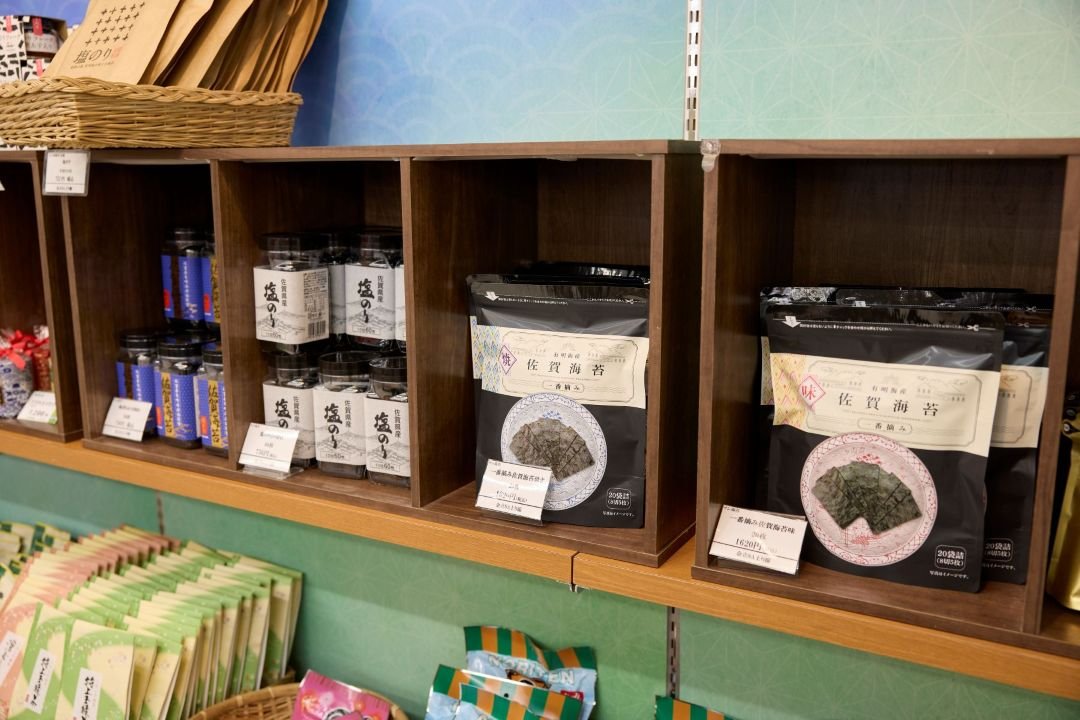 ショッピングコーナーの奥にある「佐賀発掘コーナー」。ここには、地元佐賀の名品・嬉野茶や海苔などを使った様々な商品が並び、ひとたび立ち寄れば佐賀の新たな魅力と出会うきっかけになるはず。佐賀を深掘りしたい方はぜひご覧ください。