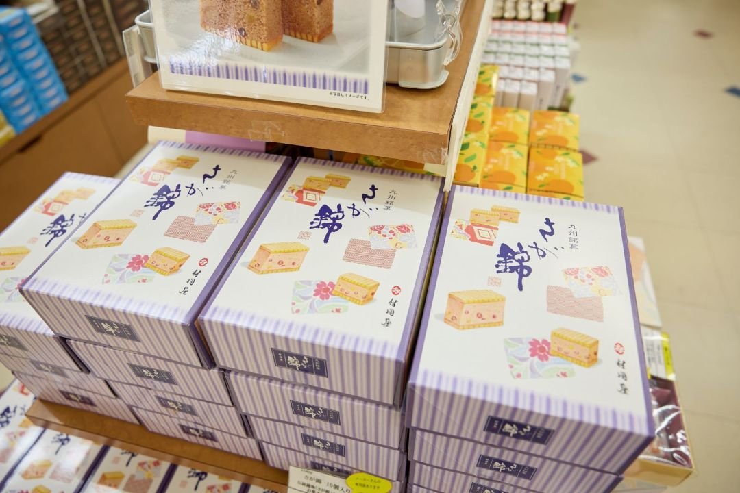 お土産販売数1位を誇るのが「さが錦」(¥1,080)。伝統織物「佐賀錦」の気品ある華やかさをイメージした佐賀県の銘菓です。小豆と栗を練り込んで、山芋でふんわり焼き上げた生地を、バウムクーヘンでサンドした和洋折衷の一品。開発には4年もの歳月が費やされ、こだわりがぎゅっと詰まっています。