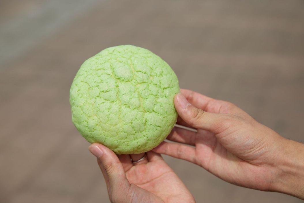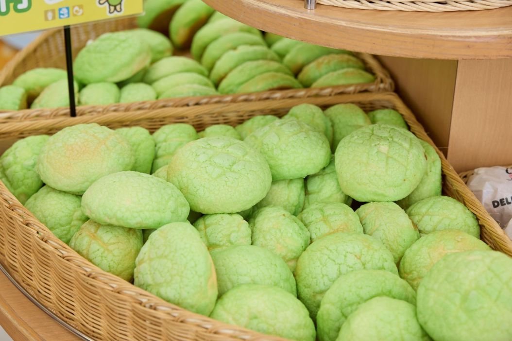 1日約1000個も売れる金立SAの看板商品「金立メロンパン」(¥216)。メロンをそのままイメージさせる鮮やかな黄緑色が目を引きく、20年以上愛され続けているメニューです。