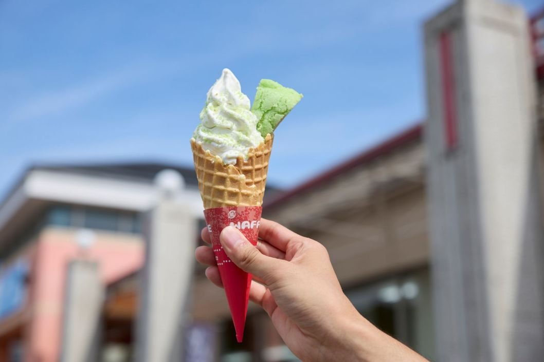 通常のメロンパンだけでなく、メロンパンとソフトクリーム組み合わせた「金立メロンパンソフト」(¥530)も大人気。ソフトクリームの上に、ザク切りしたメロンパンとクッキー生地を上からまぶした贅沢な一品です。メロンパンと冷たいソフトクリームの組み合わせは、相性抜群です。