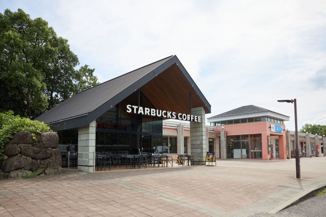 緑に囲まれた敷地に立つ当SA。すぐ隣にはスターバックス、さらにワンちゃんが思い切り遊べるドッグランも!長時間のドライブで退屈してしまった愛犬も、ここで一緒にリフレッシュできます。