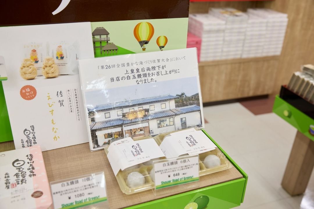 福岡から佐賀・長崎方面に向かう道中に位置する金立SA(下り線)には、福岡・佐賀などのお土産が並びます。一番のおすすめは明治15年創業・元祖吉野屋の「白玉饅頭」(6個入 ¥648)。添加物などは一切使用せず、安心して味わえる佐賀県の名物です。