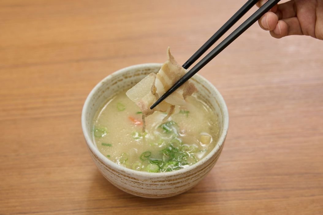 アジフライと一緒に味わいたいのが、じっくり煮込んだ具沢山の手作り豚汁。野菜の甘みと豚肉の旨味が溶け合ったほっとする味わい。湯気とともに広がる香りが食欲をそそり、心も体も温まる一杯です。