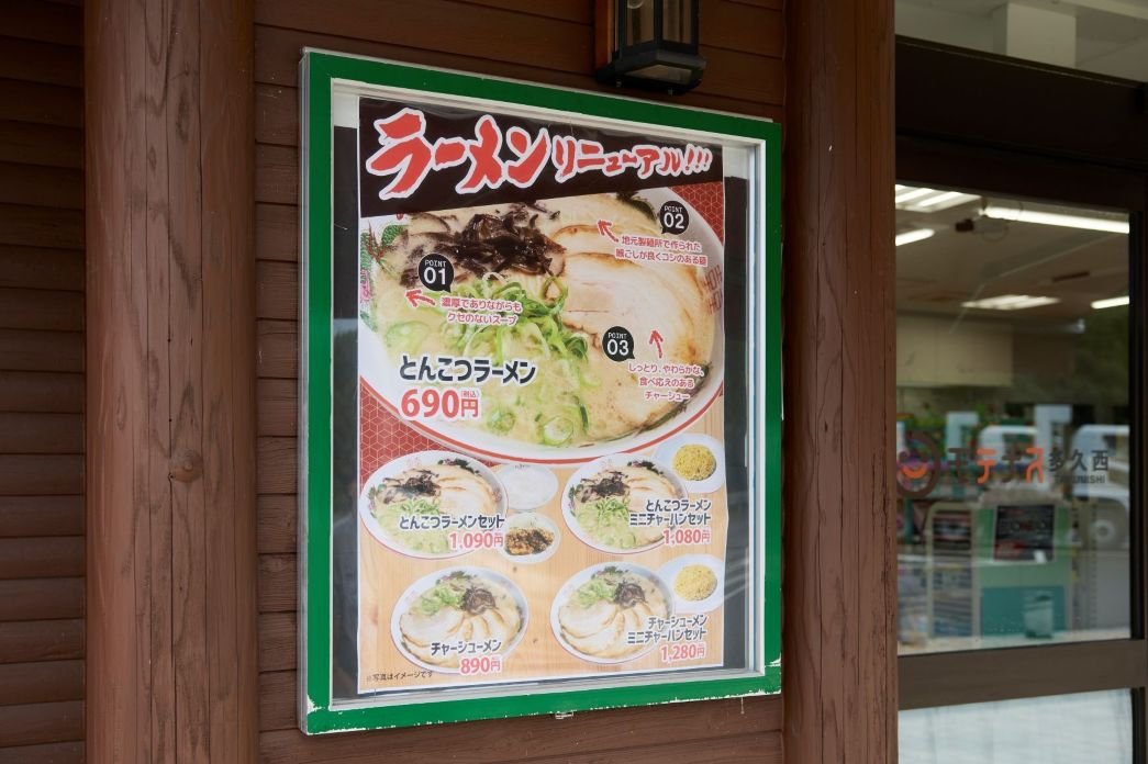 多久西PA(下り線)自慢の「とんこつラーメン」(¥690)。濃厚でありながら口当たりの優しい豚骨スープと地元製麺所で作られたコシのあるストレート麺が特徴です。しっかり食べ応えのあるチャーシューも加わり、満足の一杯です。