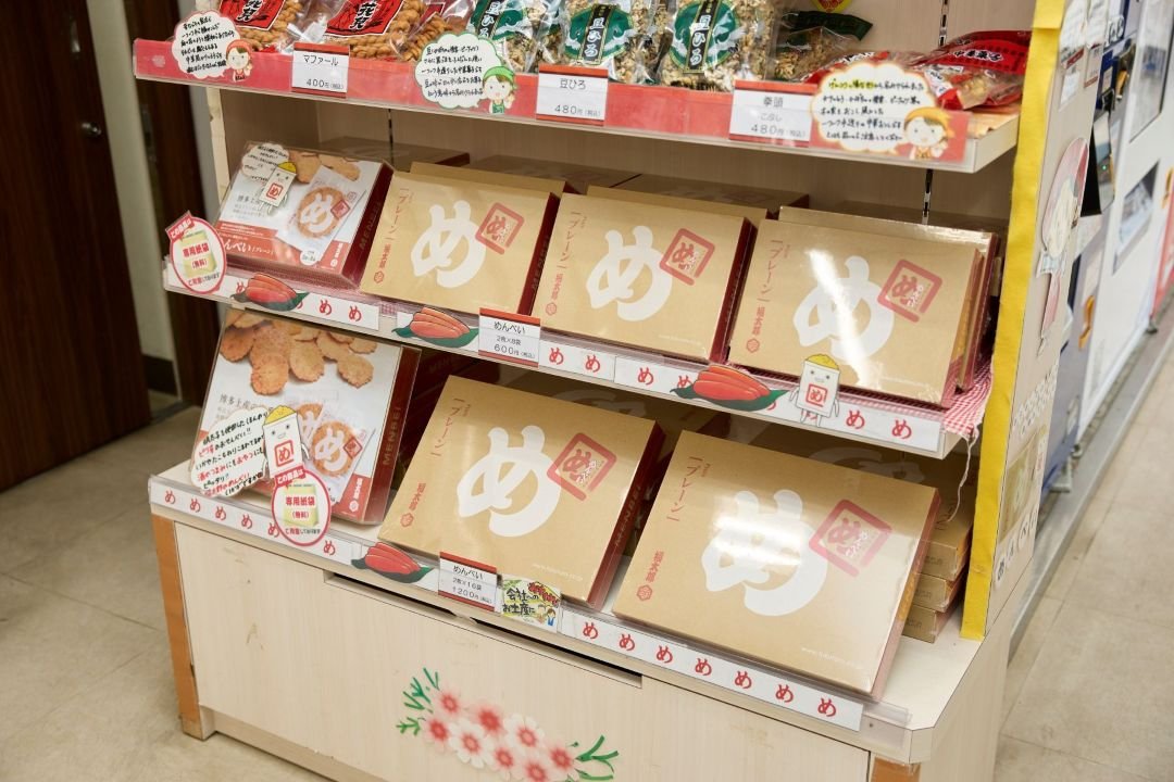 そのほか、福岡土産の定番「めんべい」(16袋入 ¥1,200)は、辛子明太子を練り込んだ風味豊かなおせんべいです。パリッとした食感と、明太子のピリッとした辛さ、イカやタコの魚介の旨味が絶妙なバランス。おやつにも、おつまみにも喜ばれる博多の味です。