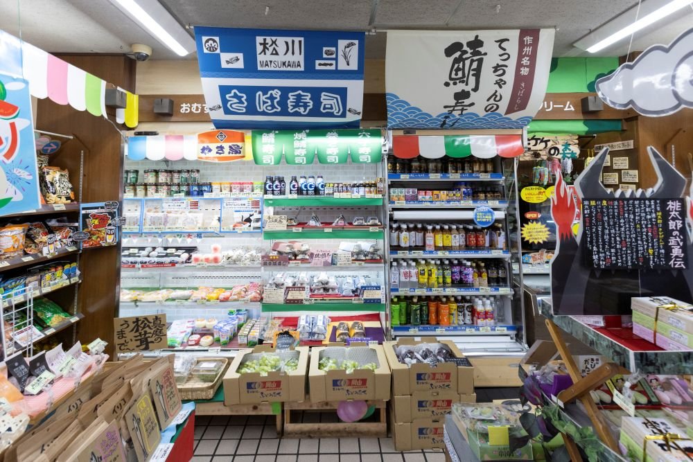店内には、「てっちゃんの鯖寿し」「松川 さば寿司」など、地域の鯖寿司文化を象徴する看板がずらり。岡山名物の麺類を大きくアピールする華やかなPOPも存在感を放っています。どれも商品への深い愛情が感じられる、にぎやかな売り場です。