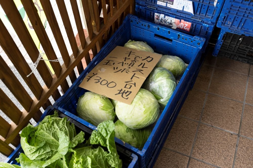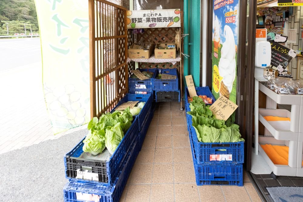 店舗の入り口にある野菜・果物販売所では、「おばあさんの白菜」や「カルスト台地で育ったキャベツ」などPAのスタッフが名付けたユニークな商品名が並びます。地元の農家さんが丹精込めて育てた野菜や果物が勢揃いです。