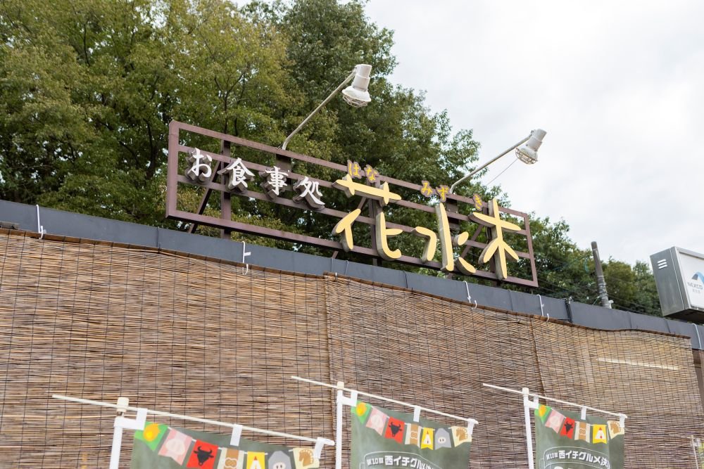 「お食事処 花水木」という可愛らしい看板が印象的なPAです。そのすぐ隣を見ると、たくさんのベンチが並び、穏やかな時間が流れています。開放感あふれる憩いの空間で、食後のひとときや旅の合間に、ゆっくりとくつろぐのもおすすめです。