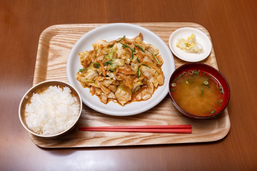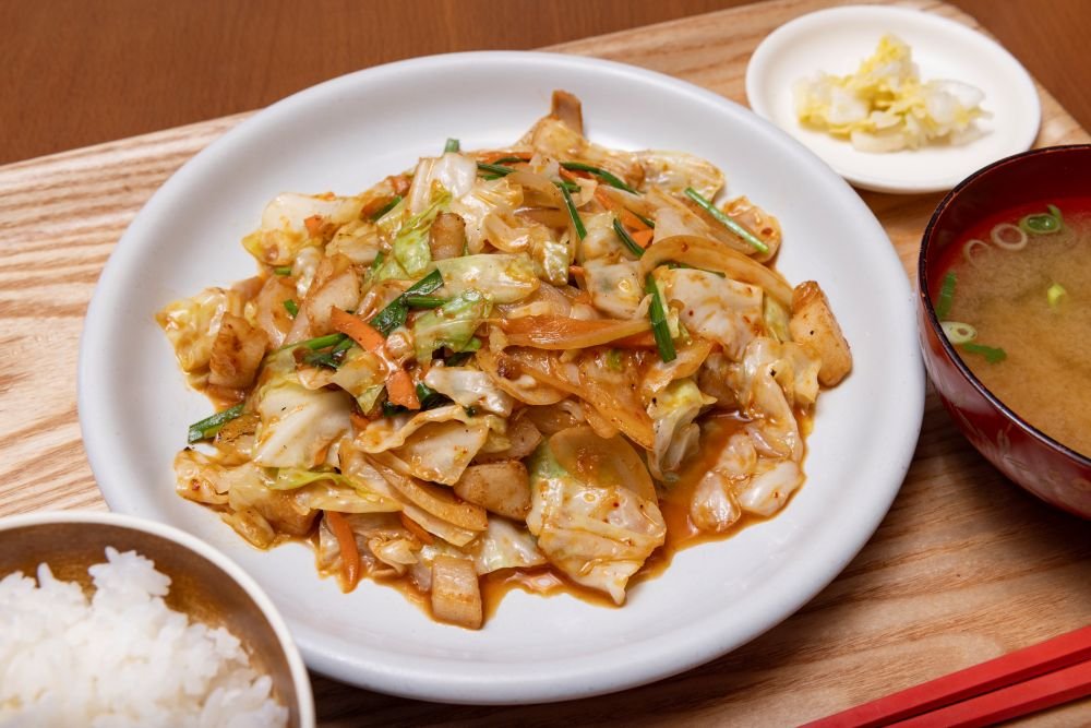 人気メニュー「ピリ辛ホルモン定食」(¥930)は、弾力のあるホルモンとシャキシャキのもやし・キャベツをピリッと辛い味噌ダレで炒めた逸品。なんと、ご飯はおかわり無料!ピリ辛味でご飯を口に運ぶ手が止まりません!