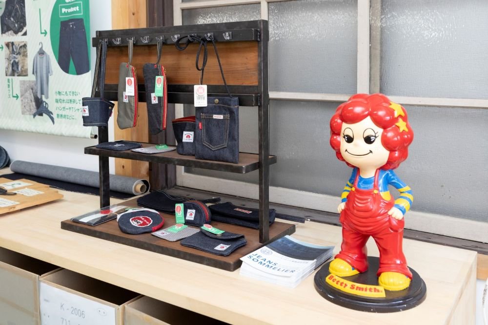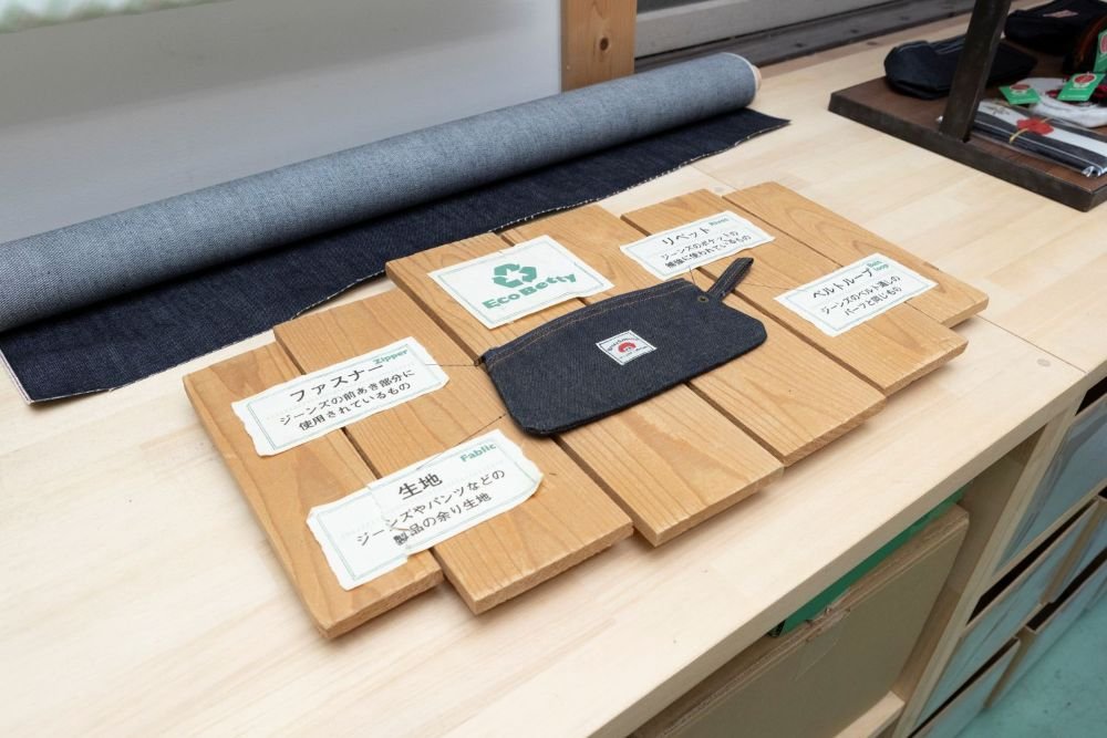 エコベティプロジェクトとして、環境問題に配慮したリサイクル商品の販売も行っています。端切れを使ったペンケースがその一例です。実はこれ、元々デニム工場見学のお土産として小学生にプレゼントするためにつくられたもので、当初販売する予定はありませんでした。