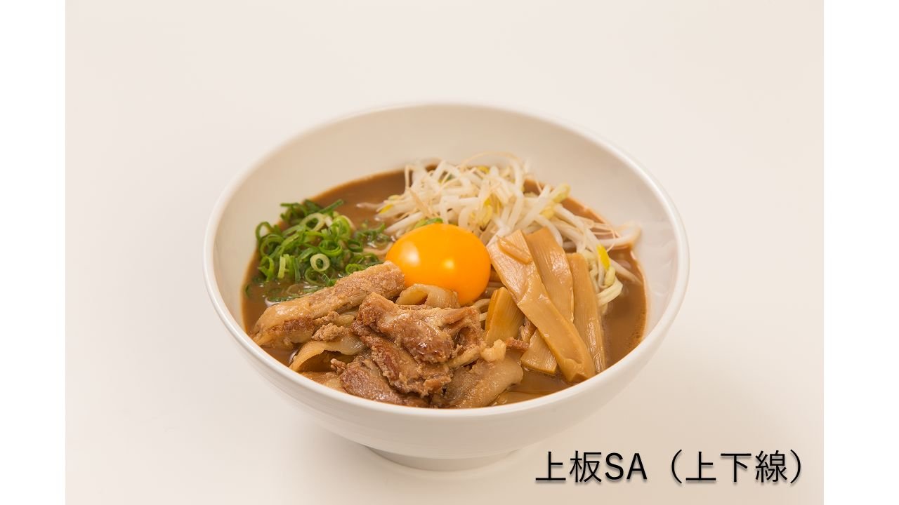 上板SA(上下線)や吉野川SA(上下線)で味わえる徳島ラーメンも大人気。豚骨醤油のスープに甘辛く煮た豚バラ肉、さらに真ん中に浮かぶ生卵が特徴で、まるですき焼きのようなちょっと変わったご当地ラーメンです。