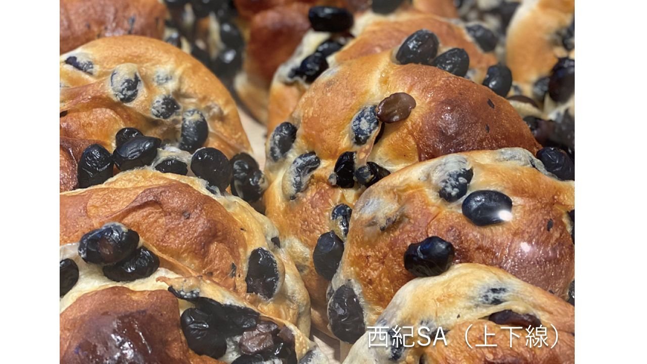 中でも人気は西紀SA(上下線)の黒豆パン。丹波篠山の名産品である大粒の黒豆がパンの表面にぎっしり並び、インパクトも抜群です。他であまり見ない特別な味わいで、お土産にもぴったり。