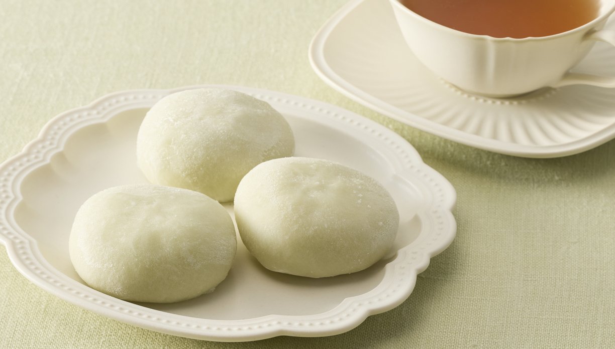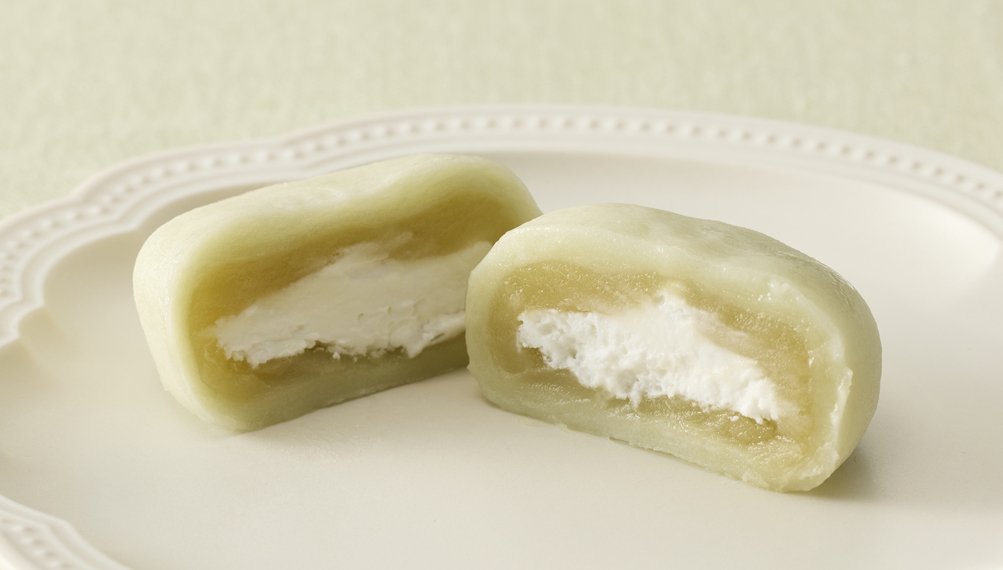 もちもちの皮に、岡山県産のシャインマスカットをふんだんに使用したフルーティーなピューレと餡、そして生クリームが入ったリッチな大福。さわやかなシャインマスカットの風味と上品な甘さが口いっぱいに広がります。