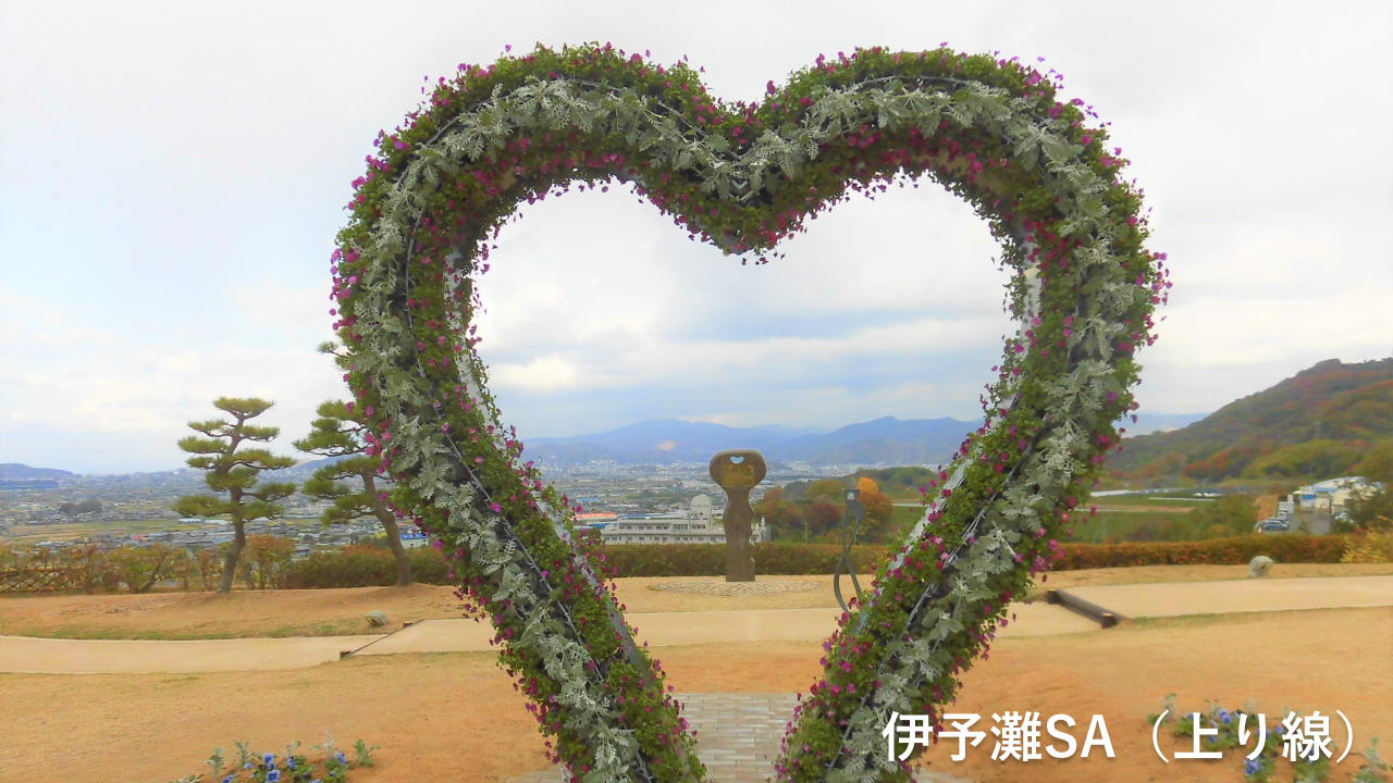 高速道路のSAが恋人の聖地として認定されたのは、伊予灘SAが初めて。上り線には花で飾られたハート型のトピアリーが設置されています。ハートを覗いた中心に見える鍵のモニュメントは、「二人のハート(愛)に鍵をかけて永遠の愛を」というコンセプトを元につくられました。