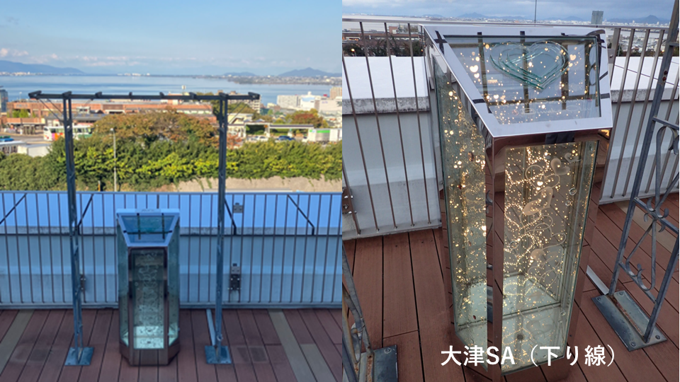 日本初の高速道路である名神高速道路の開通と同時に、日本初のSAとしてオープンした大津SA。実は恋人の聖地として認定されていて、上り線の駐車場には大きなハート形のモニュメント、下り線の3階デッキには夜にきらりと光るハートが刻まれたクリスタルのモニュメントがあります。