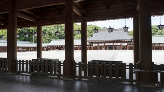 素木造りの第一鳥居がいざなう約300mの表参道を通り、南神門をくぐって広大な前庭が広がる外拝殿へ。通常は外拝殿にてお参りすることができ、事前予約ののち玉串料を奉納すれば内拝殿での参拝も可能です。外拝殿前庭より北神門を抜けると、畝傍山の登山道へと続く北参道や、緑が広がる森林遊苑があります。