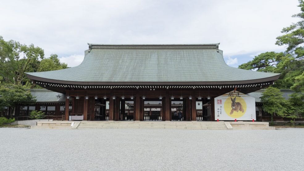 神武天皇が第一代天皇として即位された畝傍山東南麓の橿原宮址に、御聖業を仰ぎ、1890(明治23)年に創建されました。境内には、入母屋造の外拝殿やその年の干支が描かれた大絵馬(写真)など見どころが多数。京都御所の内侍所(賢所)を移築した御本殿は、国の重要文化財に指定されています。