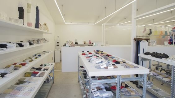 入口すぐのショップエリアには、色とりどりの靴下やアームカバーがずらり。素材や編み方のバリエーションが豊富な約40種ものオリジナル商品が並びます。高品質で快適な履き心地と、スタイリッシュなデザイン性が魅力です。