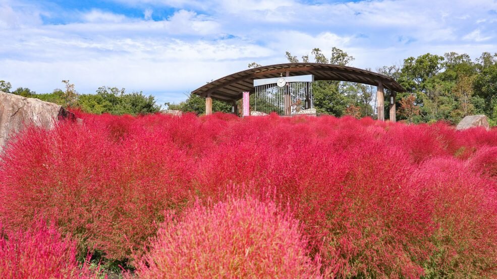 標高約70mのなだらかな丘陵地にある公園で、コキアの紅葉(写真、9月下旬~10月中旬)をはじめ、サクラやチューリップ、バラ、ヒマワリ、ハナショウブなど、四季を彩る花景色が見どころです。一画には馬見古墳群を擁し、中央エリアにある「公園館」では展示や映像を通して古墳について学ぶことができます。