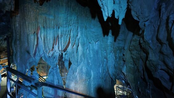 薄暗い空間を進むワクワク感がたまらない!数万年をかけて形成されたフローストーンや巨大な石柱など、間近に迫る鍾乳石が迫力満点です。遊歩道や階段は滑りやすいので、見学中は注意して進みましょう。