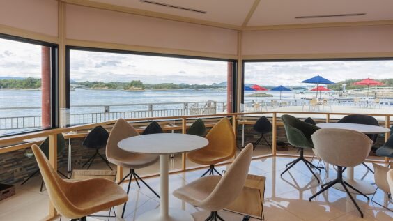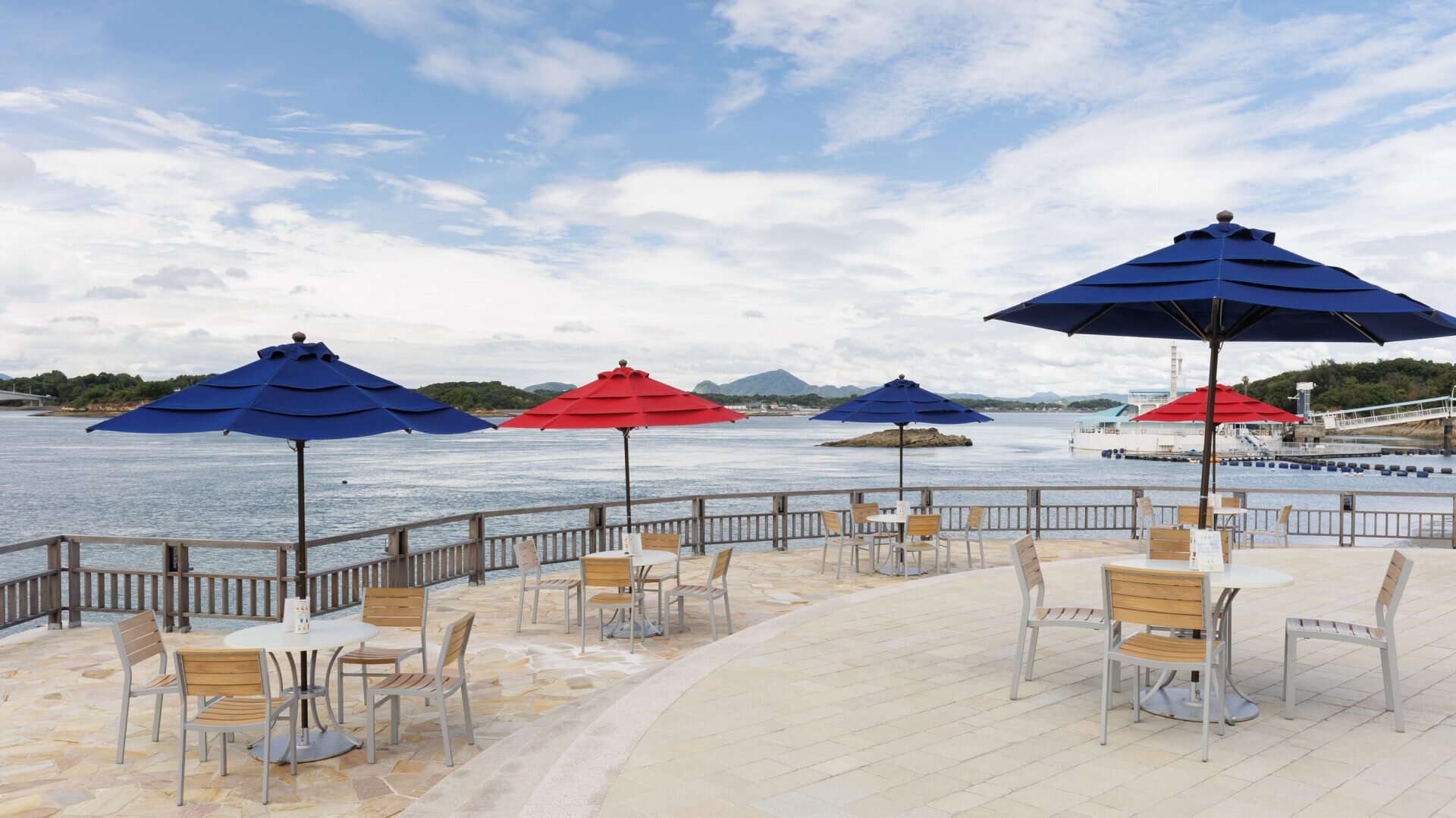 レストランや土産処、遊具広場が集まった「天草パールガーデン」。「café do mar」(写真)は天草の海や空、島々を一望する絶好のロケーションで、心地よい海風を感じられるテラス席の利用もおすすめ。ブレンドコーヒーやスイーツ片手にゆったり過ごせます。