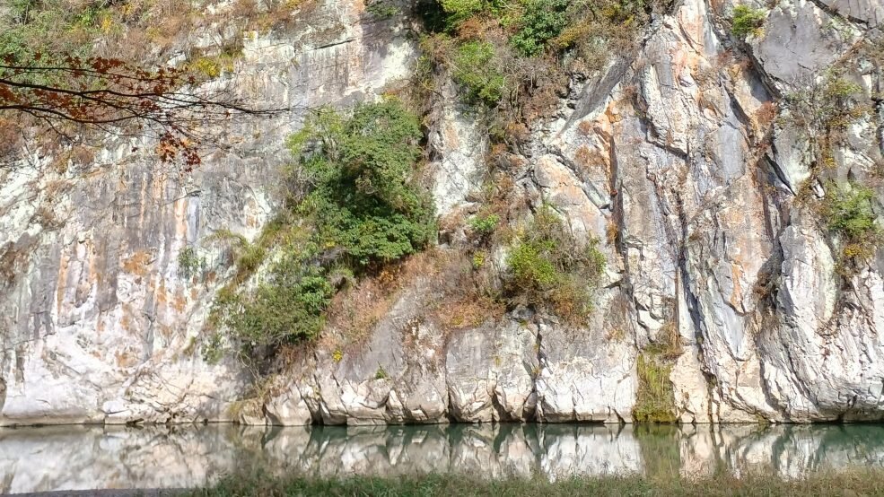 岸壁と紅葉が織り成す美景をバックに秋散歩を満喫