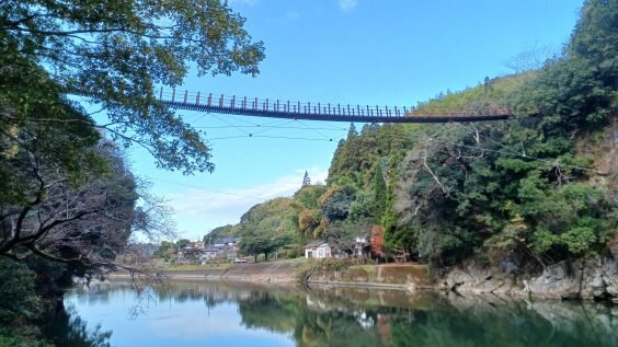 氷川に架かる吊橋「火の国橋」は、足元に隙間があり川が見えるため、かなりスリル満点。長さ71m、高さ20mあり、橋上から大岸壁を見下ろす景勝スポットとして人気です。高さ56mの「龍神橋(りゅうじんきょう)」も要チェック。