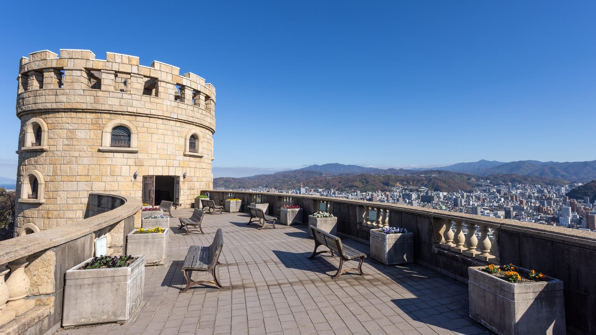 松山市制100年を記念し、標高126mの大峰ケ台に造られた公園。市花である約500種ものツバキをはじめとする季節の花木に彩られ、憩いの場として賑わいます。展望広場にはヨーロッパの古城を思わせる展望台が立ち、松山市内から瀬戸内海、四国連峰までを見渡すことができます。