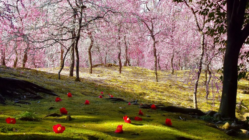 平安京の守り神として創建され、「方除(ほうよけ)の大社」で知られる神社。神苑には『源氏物語』に描かれた80種以上もの花や木々が植えられ、源氏物語花の庭として親しまれています。なかでも特に美しいのが2月中旬〜3月中旬の「春の山」。約150本のしだれ梅が花開き、色、形もさまざまな約120種400本の椿も見ごろに。華やかな香りと光景が、春の訪れを知らせてくれます。