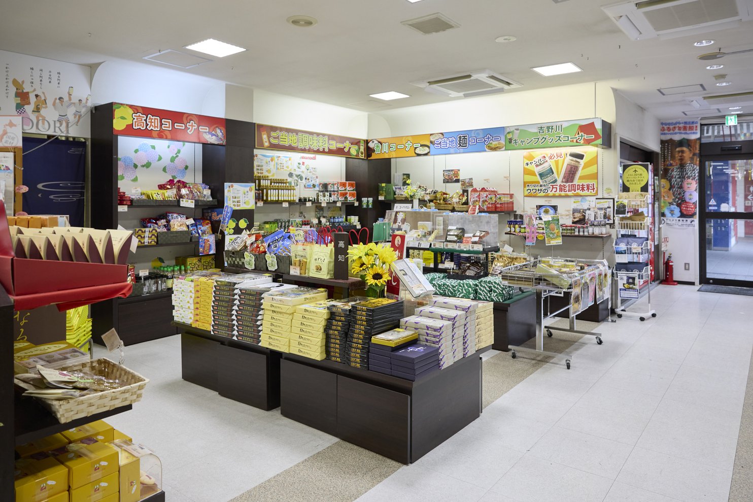 ショッピングコーナーでは、四国中心のバラエティー豊かな商品を揃えています。徳島、香川、愛媛、高知各県のコーナーを設置。ご当地ならではの商品がずらり。商品はジャンル別に見やすく配置しており、選びやすいのが特徴です。