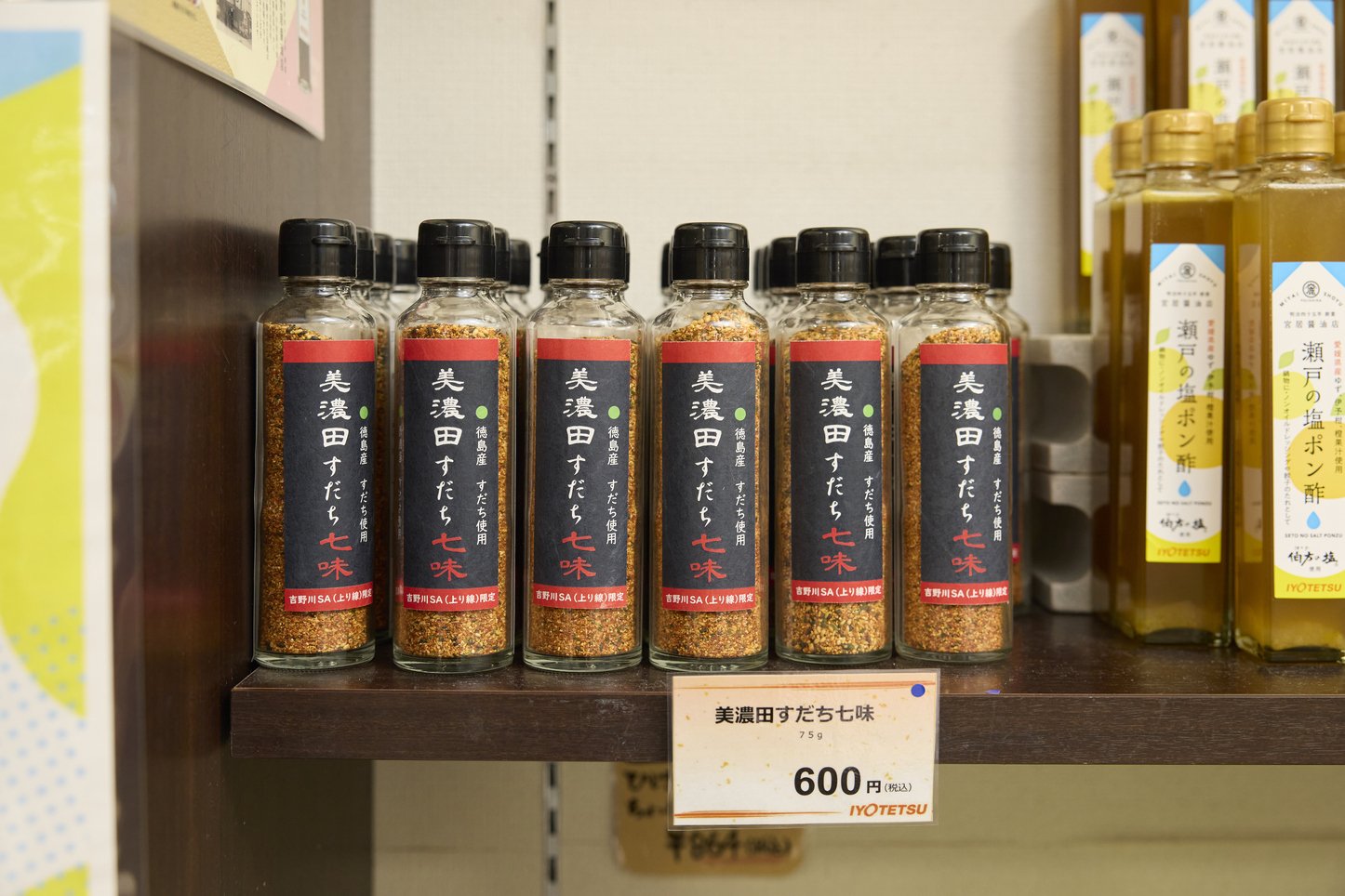 当SAでしか手に入らない限定商品「美濃田すだち七味」(¥600)は、徳島県産すだちの爽やかな香りが広がる風味豊かな一品。お土産もぴったりで、リピーターが多い人気商品です。