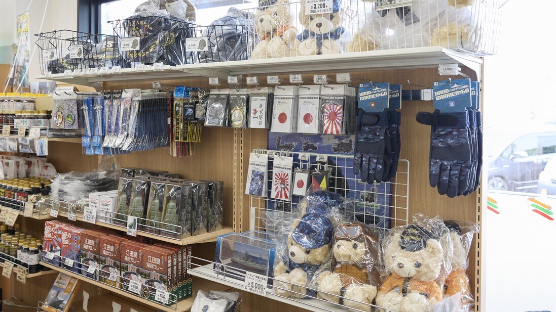 海上自衛隊の基地がある呉市が近いこともあり、関連グッズを多数取り扱い中! 戦艦大和をイメージしたシールや制服姿のぬいぐるみ、カレーライスなど、ファンにはたまらないラインナップです。