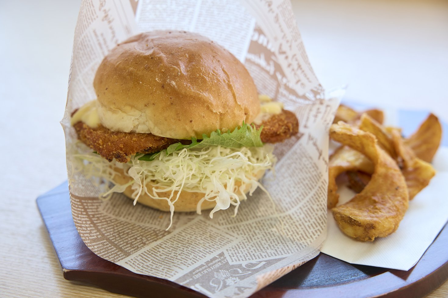 魚のすり身を揚げた広島名物“がんす”を丸ごとひとつ挟んだ「がんすバーガー」(¥1,000)。