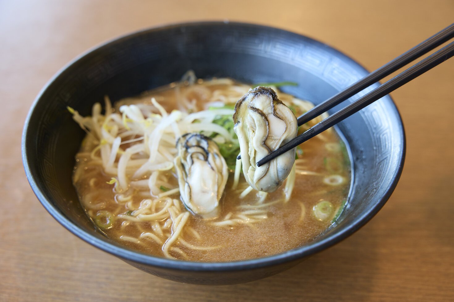 もうひとつのおすすめは、フードコートで販売中の「宮島かき味噌ラーメン」(¥1,300)。歯ごたえのある牡蠣が、噛むほどに味噌とあいまってジューシーさを引き立てます。スープには、地元味噌を使用し、豚骨スープに合わせたまろやかな味わいに仕上げています。