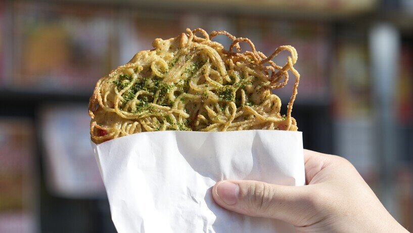 小腹がすいたら「あげおこ」(¥500)はいかがですか?お好み焼きをモチーフにした食べやすいサイズのスナック。パリパリとした食感が楽しい宮島の新しい名物です。
