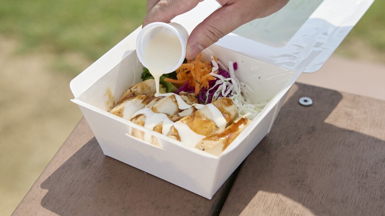 ここだけのグルメも楽しめます。手作りの「BBQチキンライス」(¥1,050)は自家製の瀬戸内レモンヨーグルトソースがチキンに合い、すっぱさと甘さがちょうどいい一品。ニューヨークのキッチンカーで売ってそうな見た目も旅行気分を上げてくれます!