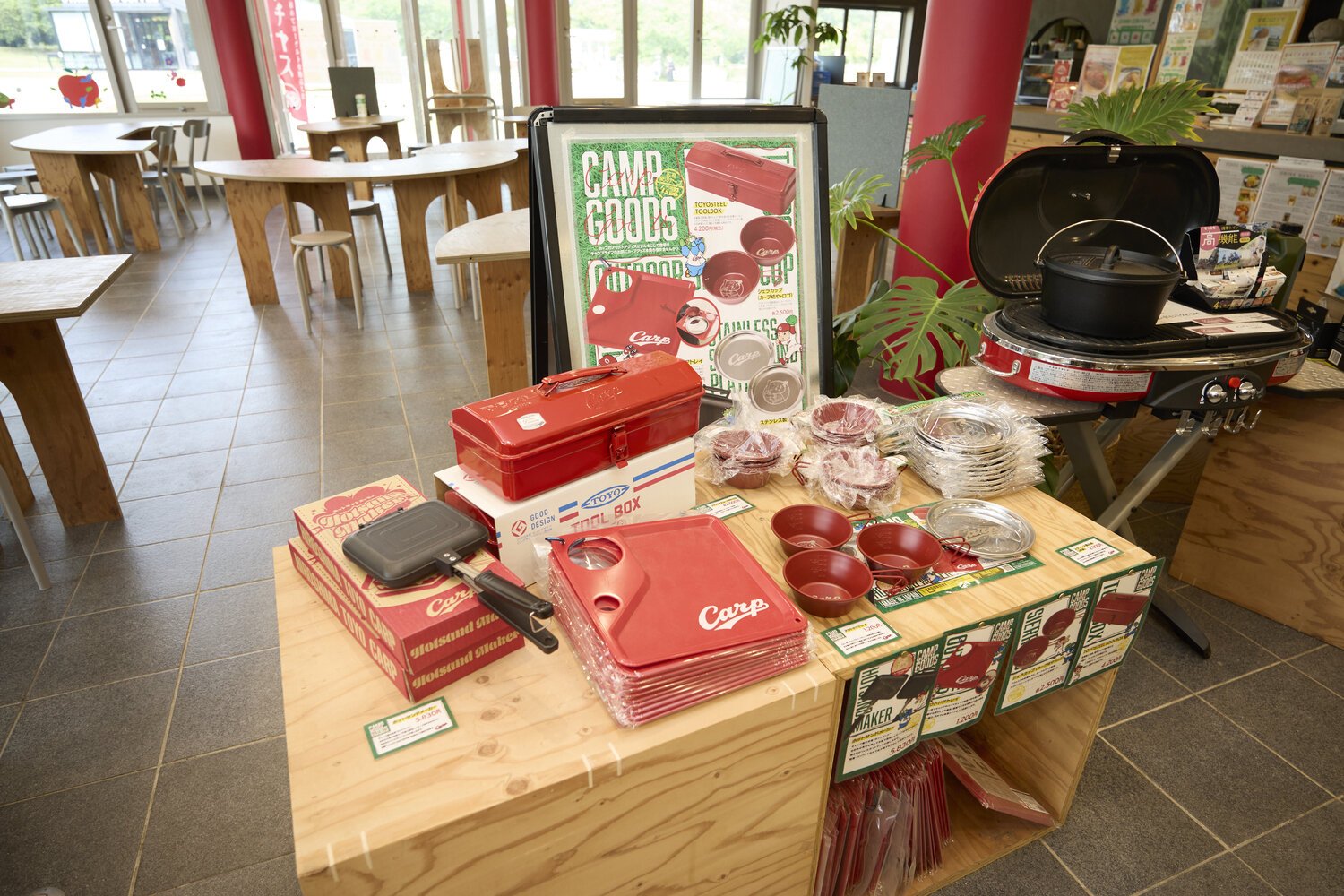 西日本の高速道路のSA・PAで唯一のアウトドアショップを併設!中へ入ると広島カープとコラボしたアウトドアグッズがずらり。チームカラーを基調とした、ファンにはたまらないアイテムです!