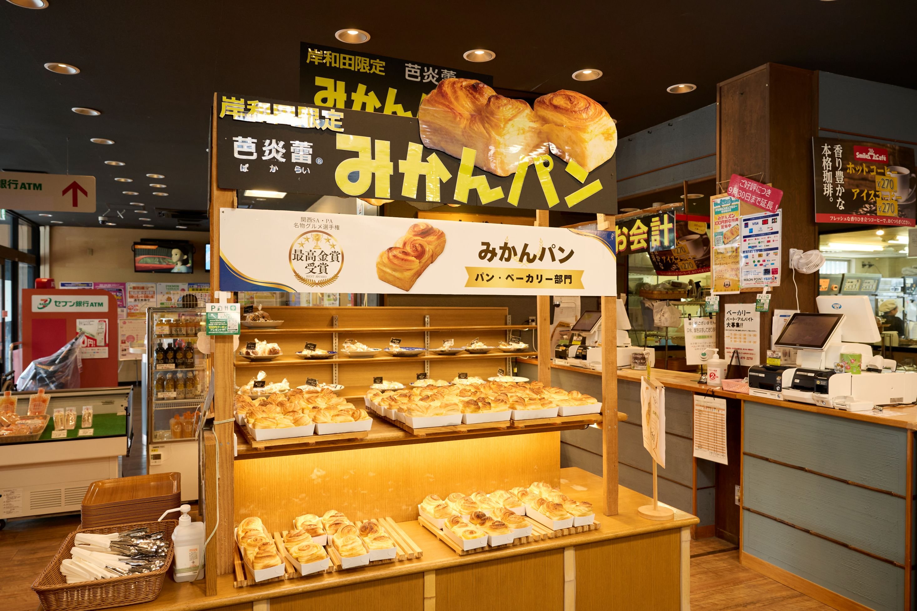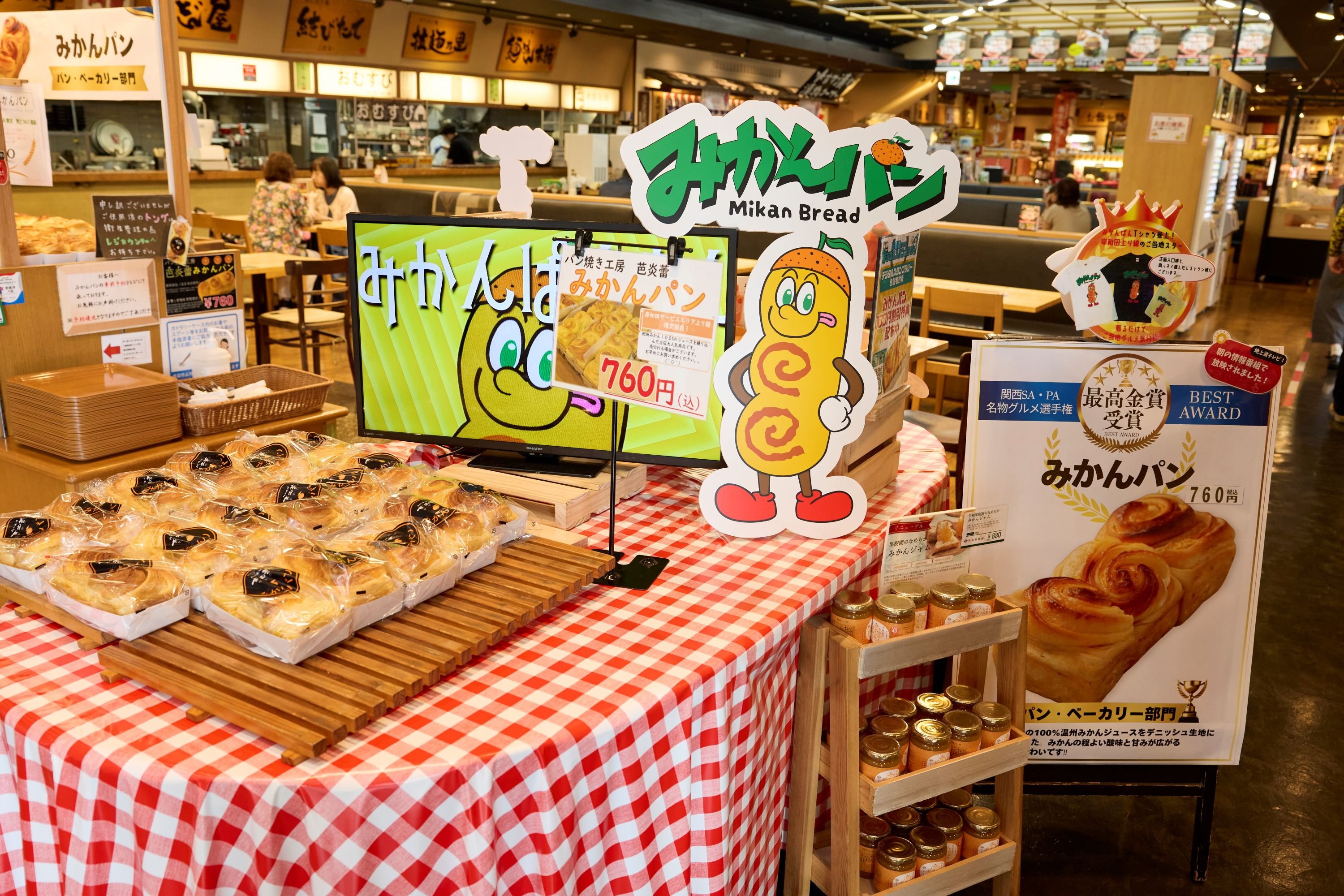 名物といえば、地元の方々にも長年愛されている「みかんパン」(¥760)。併設されたパン工房で生地作りから焼き上げまで行っているため、店内にはパンのあまい香りが漂ってきます!また、みかんパンのキャラクター「みかんブレットくん」も皆さまをお待ちしています。