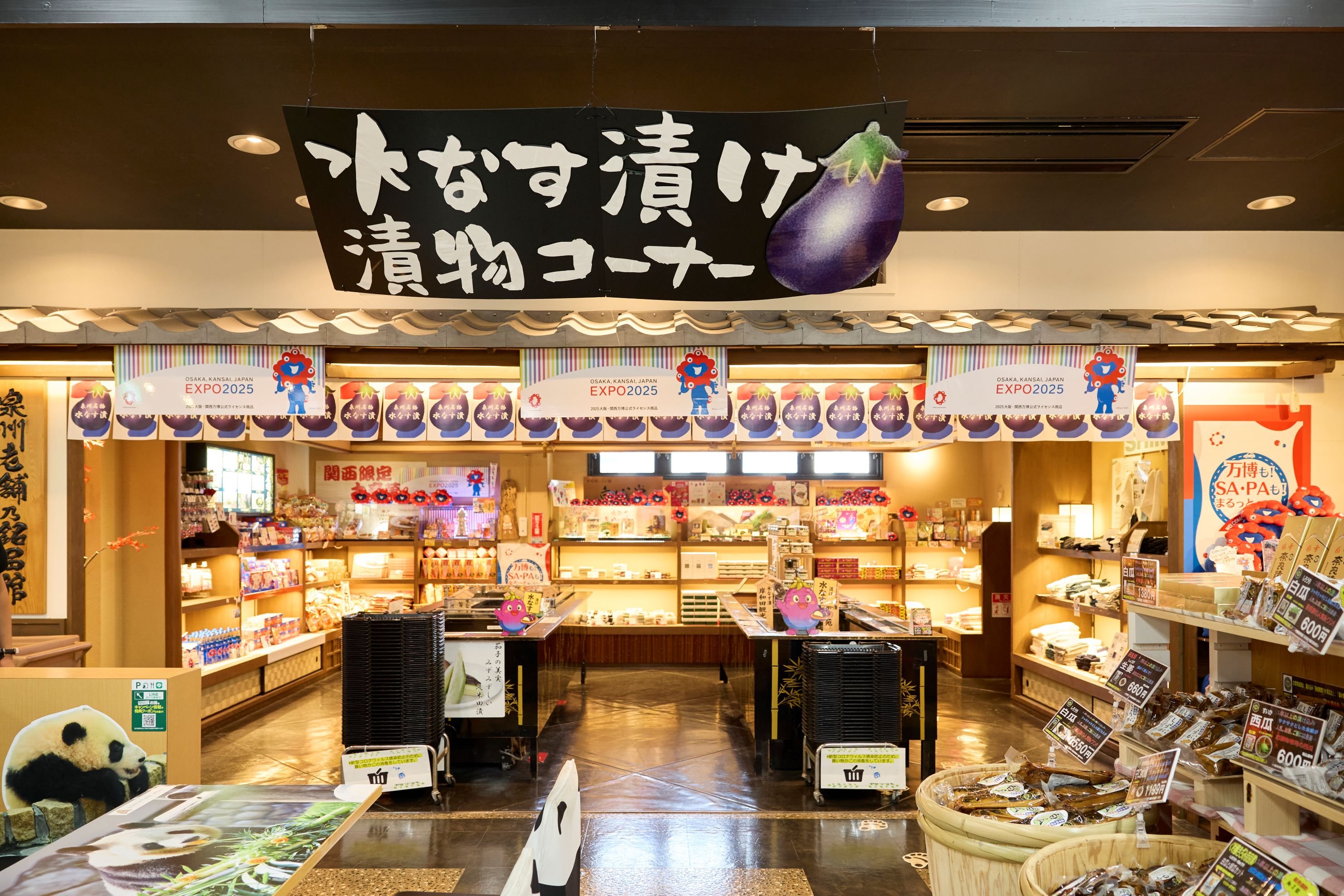 店内の一角には町家をイメージした空間があり、多種多様な泉州なすの漬物が取りそろえられています。また、ショッピングコーナーにあるステンドグラスは和歌山県出身のガラスアーティスト三浦啓子さんによる作品で、ぜひ見ていただきたいポイントです