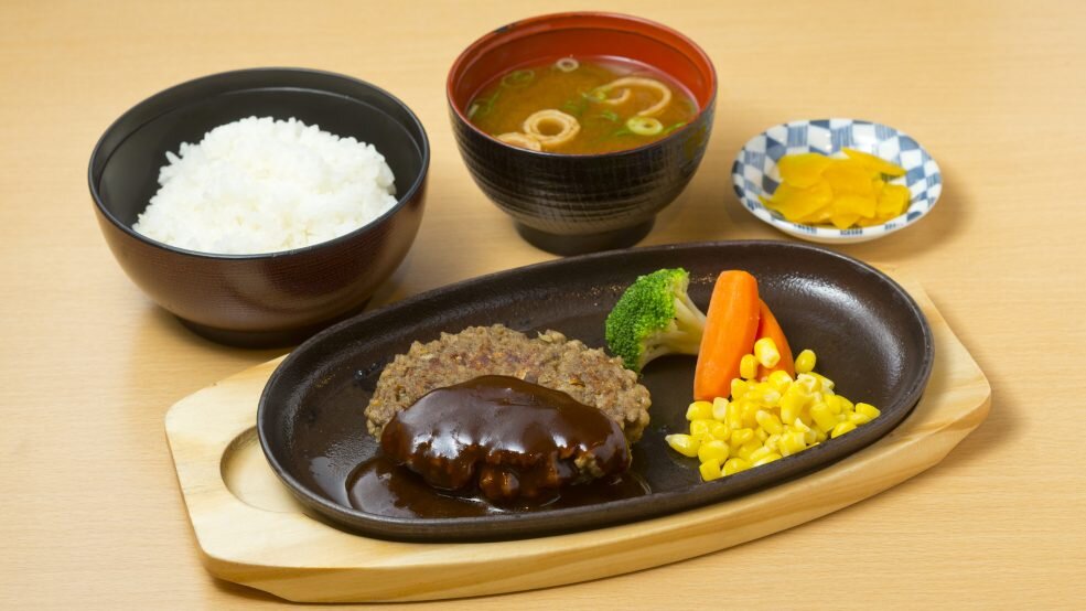 デミグラスソースは子供にも食べやすいよう、甘めの味わい。付けあわせの野菜と、ご飯、味噌汁、漬物がセットになっています。