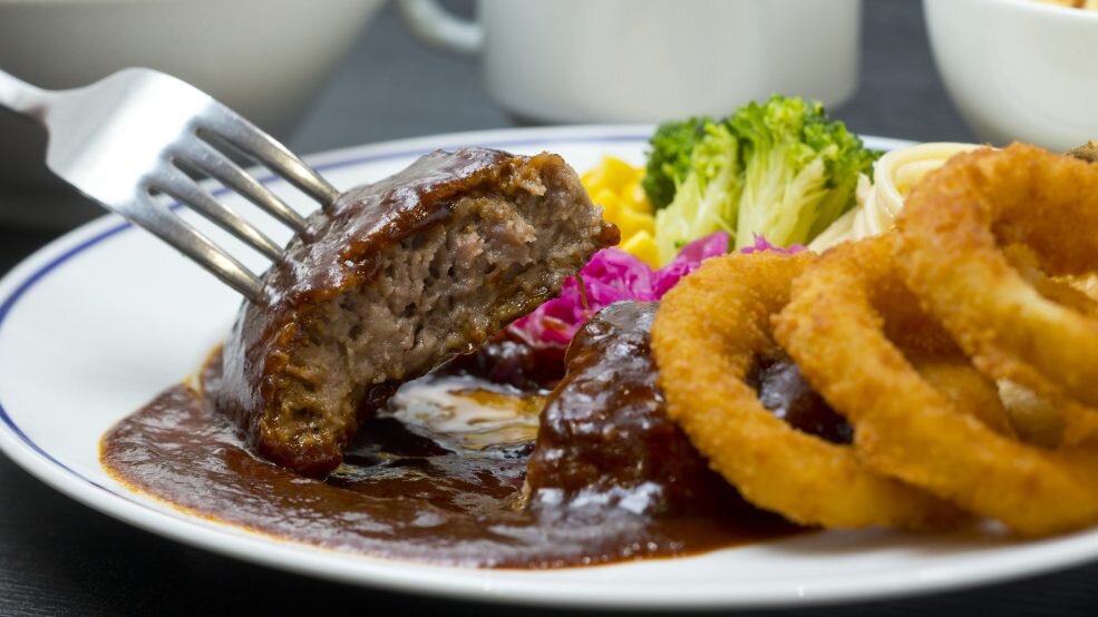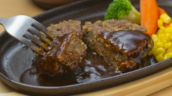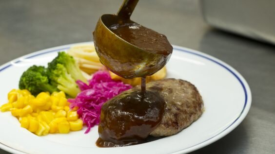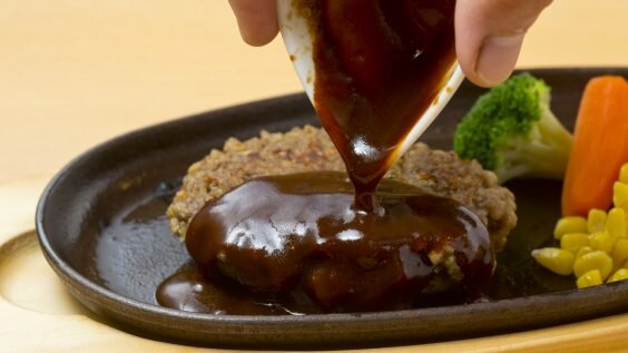 ハンバーグにあうようにと考案されたデミグラスソースをたっぷりとかけて提供されます。