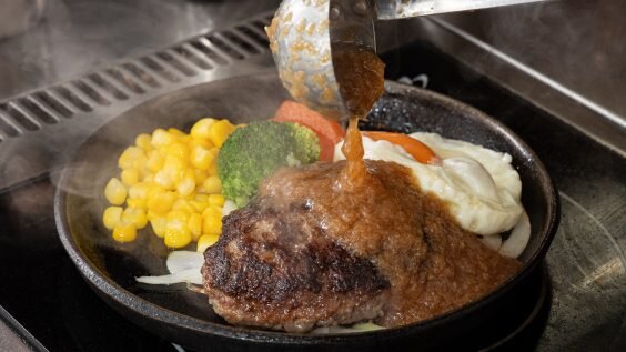 焼き上げたハンバーグは、熱々に熱した鉄板に乗せてサーブ。ハンバーグをのせた瞬間にジュウっと音をたて、食べ終えるまで熱々の状態を保ちます。